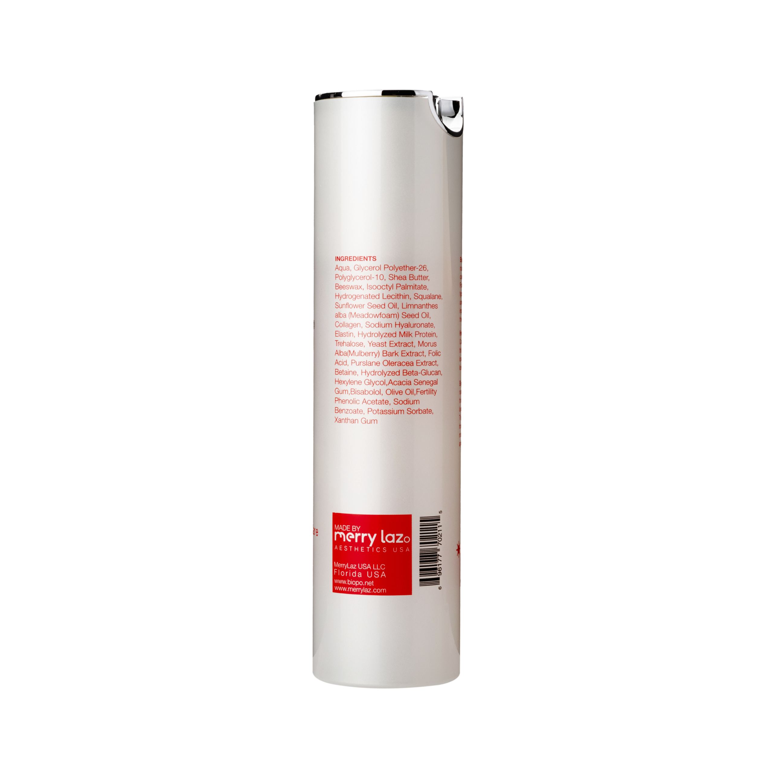 Ingredients : Aqua, Glycerol Polyether-26, Polyglycerol-10, Shea Butter, Beeswax, Isooctyl Palmitate, Hydrogenated Lecithin, Squalane, Sunflower Seed Oil, Limnanthes alba (Meadowfoam) Seed Oil, Collagen, Sodium Hyaluronate, Elastin, Hydrolyzed Milk Protein, Trehalose, Yeast Extract, Morus Alba(Mulberry) Bark Extract, Folic Acid, Purslane Oleracea Extract, Betaine, Hydrolyzed Beta-Glucan, Hexylene Glycol,Acacia Senegal Gum,Bisabolol, Olive Oil,Fertility Phenolic Acetate, Sodium Benzoate, Potassium Sorbate, Xanthan Gum.