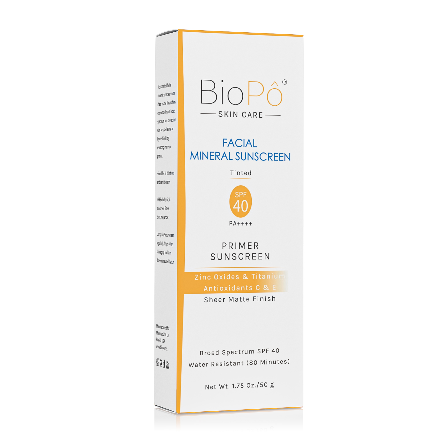 BioPo  is a sheer TINTED  facial mineral sunscreen matte finish offers cosmetic  elegant broad spectrum sun protection.  Can be used alone or layered invisibly to replace makeup primer. With Anti Oxidants C&E